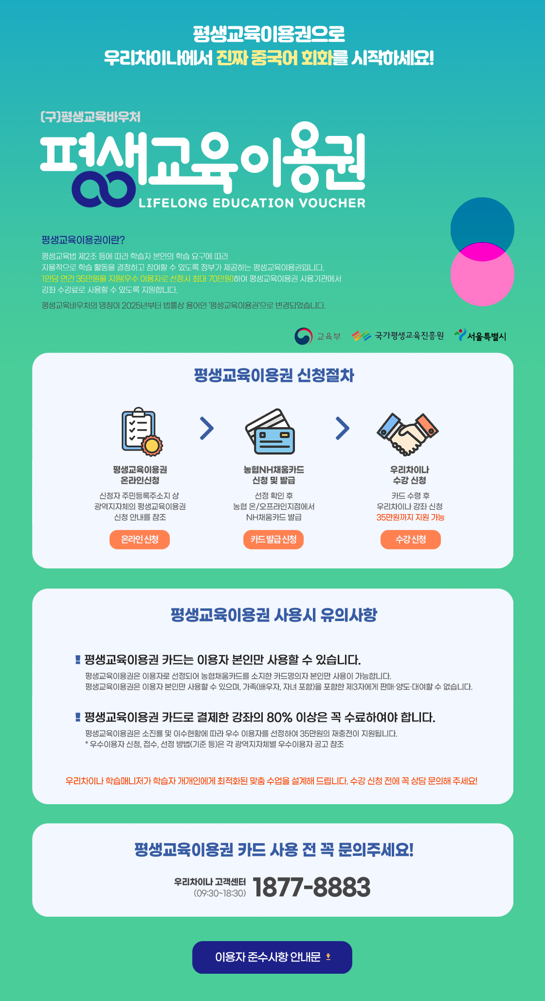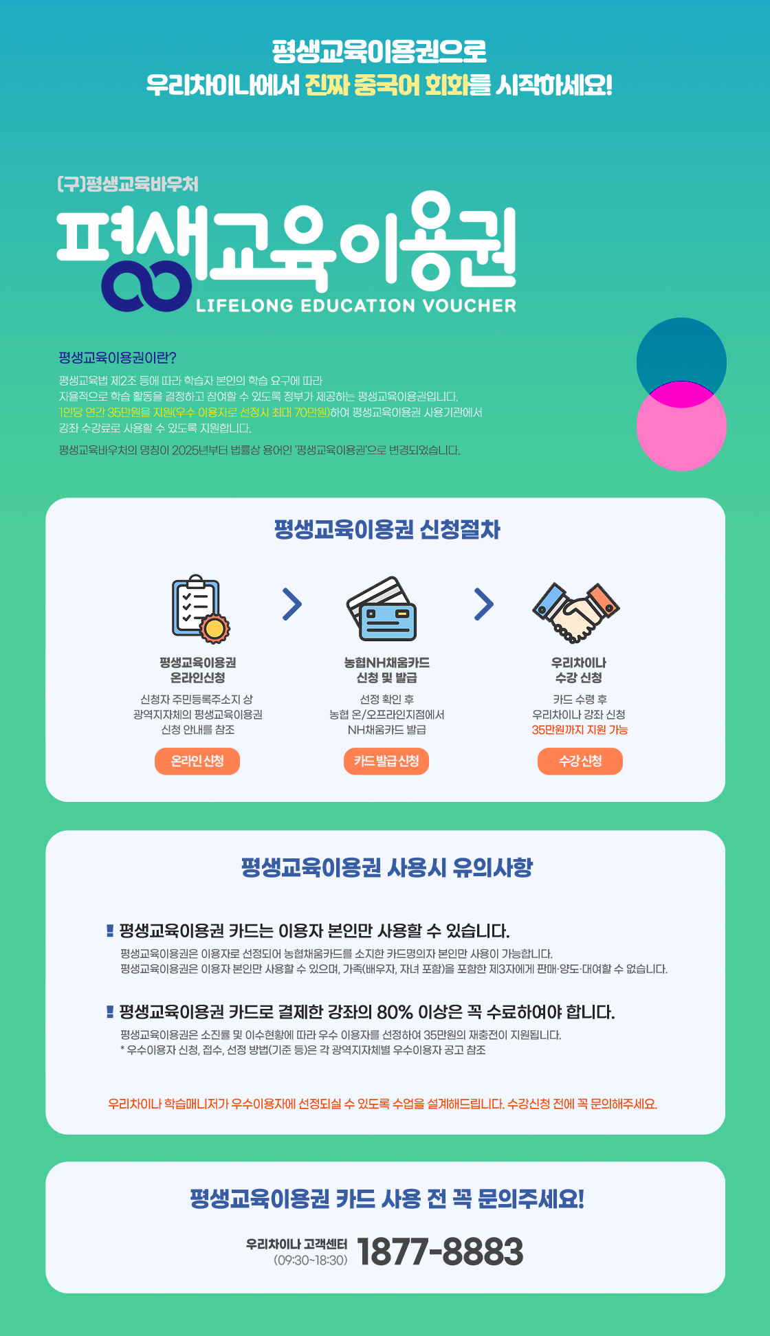 TEL : 1877-8883 | 070-7660-9768 | FAX : 02-6969-9350 운영시간 09:30 ~ 18:30 | 월~금(공휴일제외) 수업시간 06:00 ~ 24:00 | 월~금(공휴일제외) 계좌번호 : 우리은행 1005-504-441115 예금주: (주)상상에이앤이