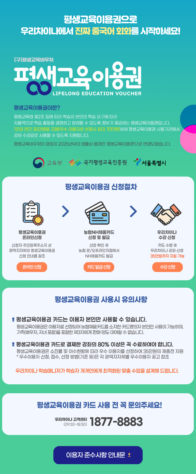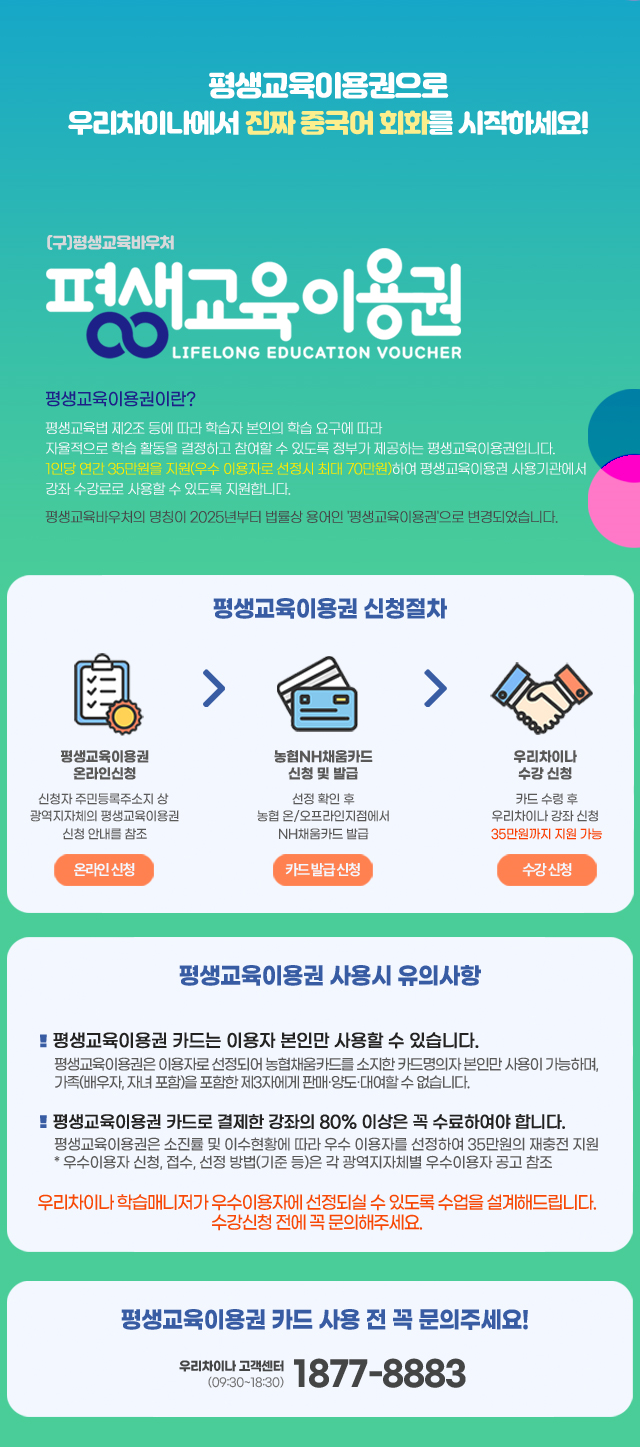 TEL : 1877-8883 | 070-7660-9768 | FAX : 02-6969-9350 운영시간 09:30 ~ 18:30 | 월~금(공휴일제외) 수업시간 06:00 ~ 24:00 | 월~금(공휴일제외) 계좌번호 : 우리은행 1005-504-441115 예금주: (주)상상에이앤이