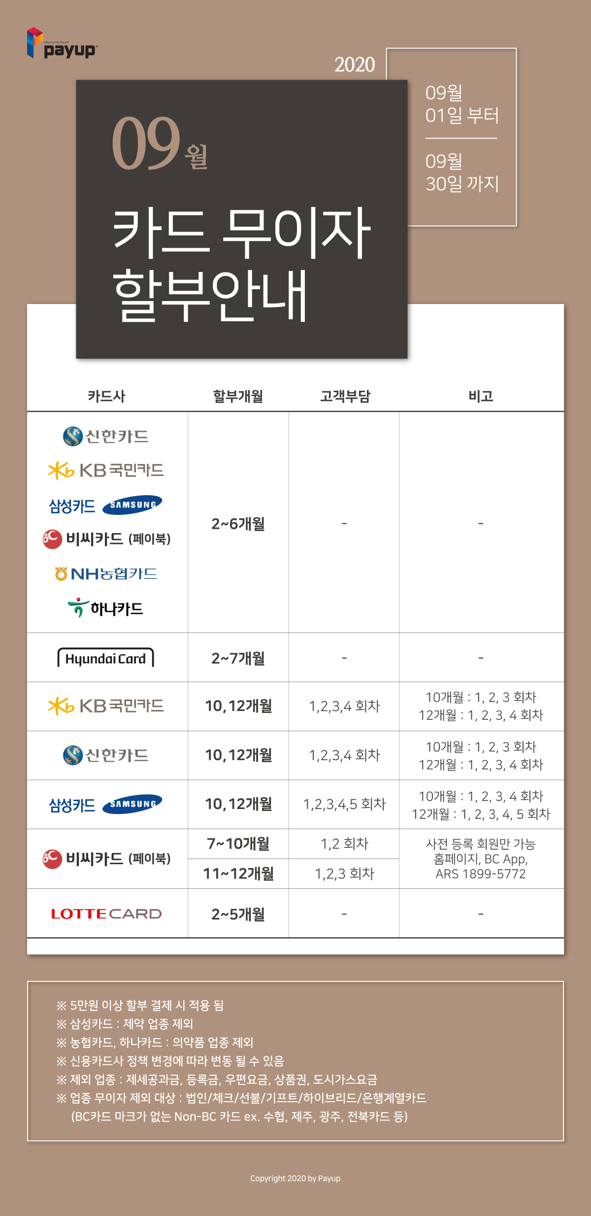 2020년 9월 페이업 신용카드 무이자할부 안내