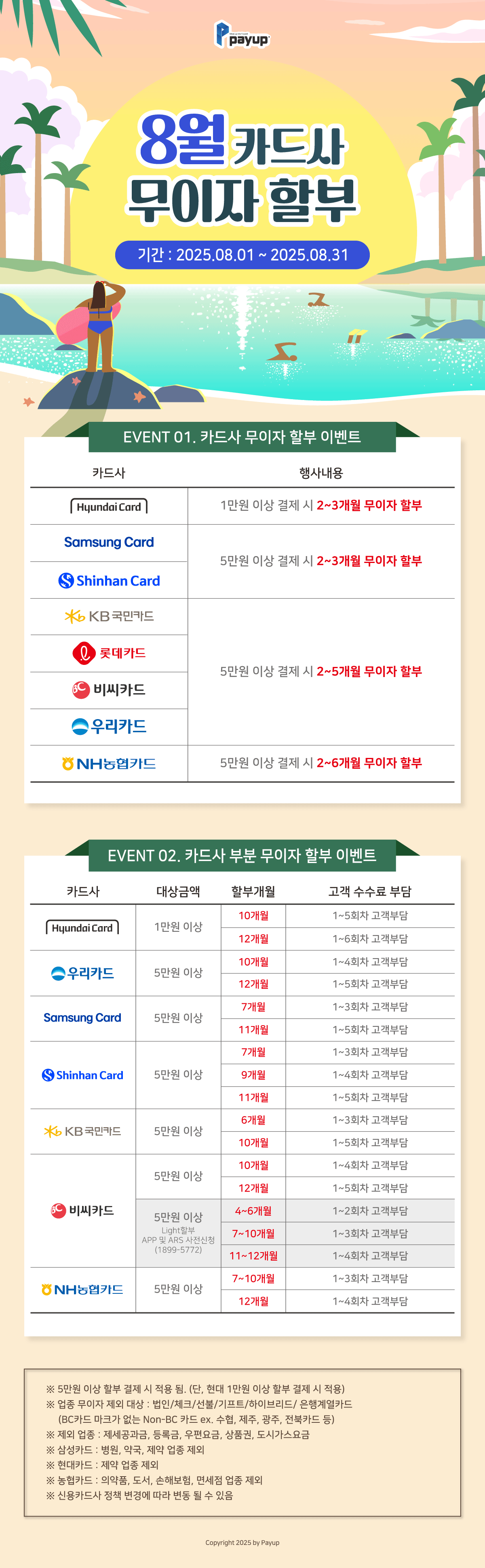 2025년 8월 페이업 신용카드 무이자할부 안내 내용