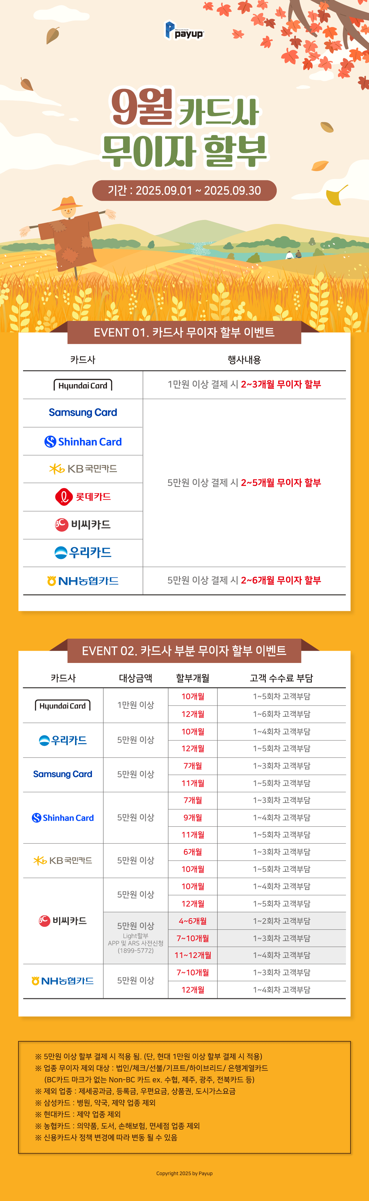 2025년 9월 페이업 신용카드 무이자할부 안내 내용